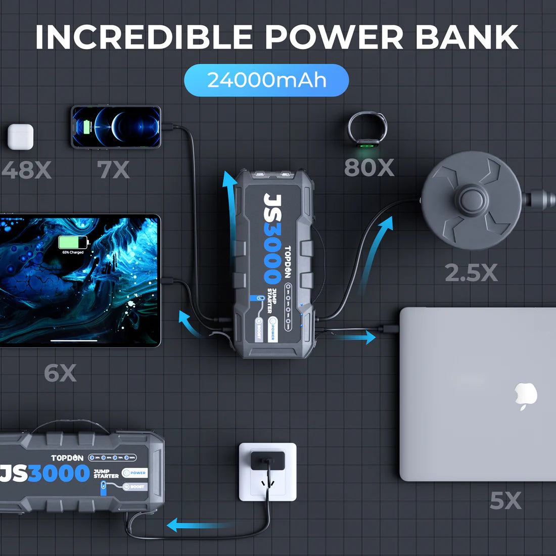 - Use the 3000 Peak cranking amps and give life-saving jumps in 1 second. The 24000mAh battery capacity can store 45 jumps in a single charge. Revive up to 9L gas vehicles, 7L diesel vehicles.