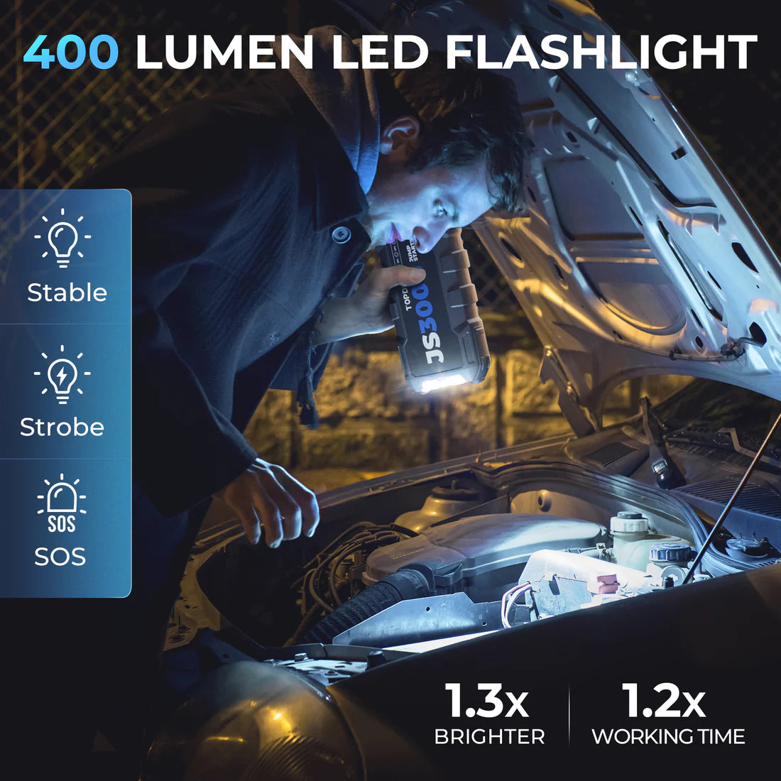 - The JumpSurge3000 is more than a Jump Starter! It’s 400 lumens flashlight brings day to the dark. Use the SOS setting to signal for help in emergencies. It’s truly an essential travel gadget.
